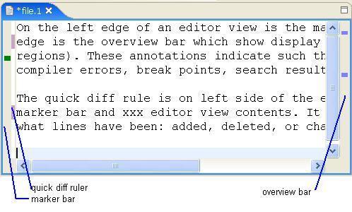 On the left edge of an editor view is the marker bar and on the right edge is the overview bar which show display annotations (as colored regions). These annotations indicate such things as: boomarks, tasks, compiler errors, break points, search results and so on.