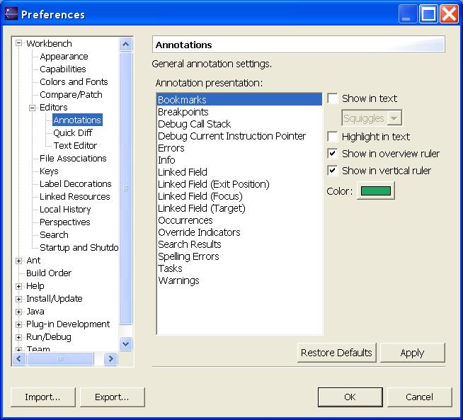 The total set of preferences can be exported to a file or imported from a file using the Import... or Export... buttons on the lower left of the preferences dialog. The file named preferences.epf contains the default setting. An individual Eclipse system may have this dialog modified in various ways including not having the Import and Export buttons.